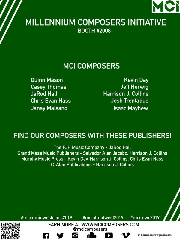 The Millennium Composers Initiative is excited to announce our return to The Midwest Clinic International Band and Orchestra Conference in Chicago, Illinois this year! To learn more about our organization and all of our members, conference attendees can visit Booth #2008 at the conference's exhibition hall. Several scheduled events this year will feature the music of our MCI composers, 10 of which will be in attendance for the conference: